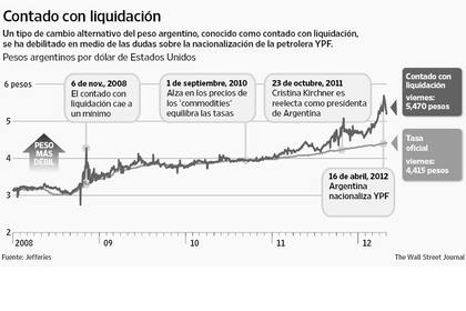 Esta cotización del dólar, conocida como "contado con liquidación", cayó el 18 de abril, dos días después del anuncio de la nacionalización de YPF, a 5,69 pesos argentinos, un descenso de 29% frente al cambio oficial. Se trata de la mayor diferencia desde noviembre de 2008, durante el apogeo de la crisis financiera.