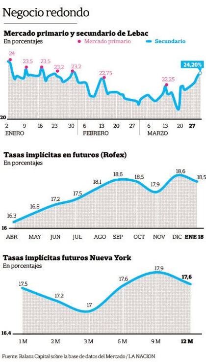 El analista financiero Christian Buteler coincide con ese enfoque: "El apretón monetario del último mes fue importante. La base monetaria se achicó en $ 30.000 millones, básicamente por la absorción vía Lebac y los incentivos vía tasa para el traspaso. Tanto presionó que el stock de pases, que había llegado a los $ 300.000 millones, cayó a $ 140.000 millones. Pero el de Lebac, que venía cayendo, en paralelo subió de $ 626.801 millones a $ 742.575 millones. De este modo, hoy entre ambos suponen un 114% de la base monetaria, lo que al BCRA le supone enfrentar una factura mensual en intereses de $ 177.050 millones. La conclusión es que el carry trade, que fue la estrella de 2016, volvió con todo. Hoy todo en el mercado volvió a ser tasa".