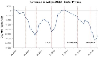 "El año 2018 se caracterizó por un incremento de la formación de activos externos del sector privado, junto a un déficit en cuenta corriente cambiaria y un desarme de posiciones de cartera, que fue compensado por el endeudamiento del sector público en el mercado y con el FMI, por el ingreso del swap con China y en mucha menor medida con inversión extranjera directa (IED)", describió la consultora en un informe.