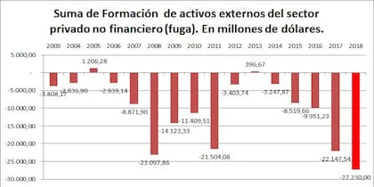 El monto superó en un 22% al registrado en 2017 (cuando alcanzó los US$22.150 millones) y pulverizó el anterior récord de salida de divisas por US$23.100 millones de 2008, provocado por la ola de desconfianza que generó el inicio de la crisis de las hipotecas en Estados Unidos.