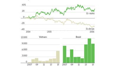 Mientras la cotización de robusta caía para los agricultores vietnamitas en dongs, subía para los productores brasileños en reales y ahora casi no registra variaciones frente al año pasado. El real acumula un retroceso de más de 30% ante el dólar en los últimos 12 meses, golpeado por la crisis de la economía brasileña y el alza generalizada de la divisa estadounidense.