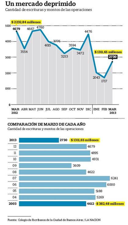 Según las estadísticas oficiales, en los primeros tres meses del año se hicieron 6490 escrituras en la ciudad por un monto total de $ 3188,4 millones, lo que implica una baja en pesos de 39,1%. En el caso de marzo, las operaciones alcanzaron su piso desde que el Colegio de Escribanos inició la actual serie, hace 15 años.