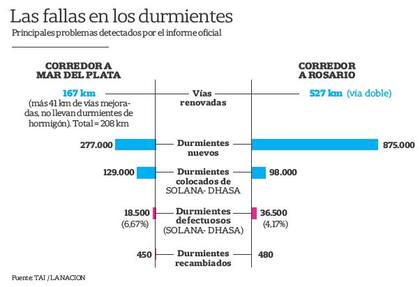 Sin embargo, las obras nunca se terminaron. Más aún, se conoció que parte de aquellos durmientes se partían a poco de instalados. Hasta estos días, unos 55.000 fueron relevados con fisuras, identificados en un monitoreo que hace Trenes Argentinos Infraestructura (TAI). Las fallas de calidad durante la producción están corroboradas por el Instituto Nacional de Tecnología Industrial (INTI), que en un informe señala que se originaron por deficiencias en la calidad del hormigón y en su proceso de curado.