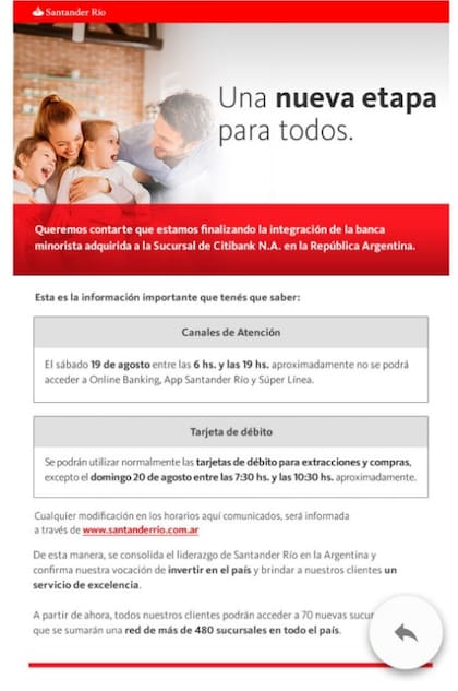 En un aviso, enviado por mail, la entidad notificó que el sábado 19 de agosto entre las 6 y las 19 no se podrá acceder a Online Banking, App Santander Río y Súper Línea.