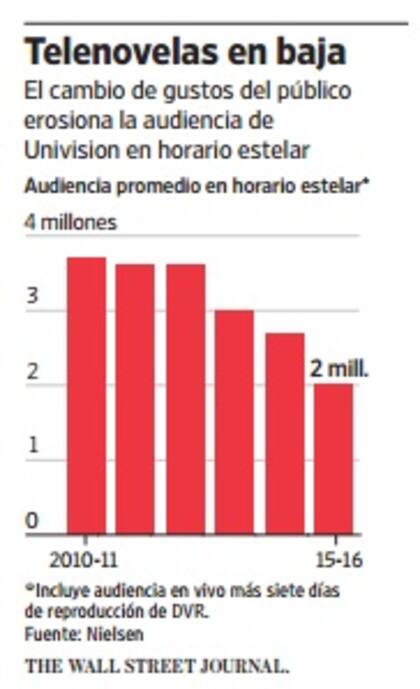 Sin embargo, su buque insignia —la cadena en español Univisión— ha tenido problemas para adaptar su programación a los gustos de los espectadores más jóvenes. Casi 60% de los 55 millones de hispanos en EE.UU. pertenecen a la Generación del Milenio, con una cuarta parte del total entre las edades de 18 y 33 años, según el Pew Research Center. Según diversos estudios, los integrantes de la Generación del Milenio— que tienen menos probabilidades de ser inmigrantes— tienden a ver televisión en inglés y se sienten atraídos por programas con contenidos más atrevidos y un ritmo más rápido que las telenovelas tradicionales.
