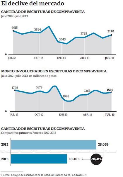 Según informó el Colegio de Escribanos porteño, en julio se firmaron en la ciudad 3120 escrituras por un monto total de $ 1566,5 millones, con un valor promedio por operación de 502.000 pesos, lo que implica una caída del 12,8% frente al mismo de 2012, aunque contra junio el precio tuvo un incremento del 15,3%. En tanto, en el acumulado de los primeros siete meses de 2013 se realizaron en la Capital Federal un poco más de 18.000 operaciones de compra-venta por $ 9367 millones, equivalentes a 1810 millones de dólares al cambio oficial, lo que representa una baja del 34,4% en el número de escrituras y del 38.8% en dólares.