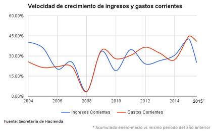 El agravamiento del rojo en las cuentas públicas comienza en 2011, desde cuando el gasto corriente ha crecido a más velocidad que el ingreso corriente.