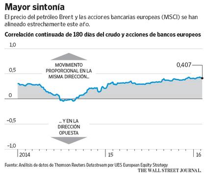 La correlación entre la cotización del crudo y las acciones de los bancos europeos está en su nivel más alto desde 2012, según datos del banco suizo UBS. "Estamos atrapados en una conexión donde los precios de las materias primas repercuten negativamente en todas las acciones y los bancos", dice Bo Christensen, analista jefe de Danske Invest, que gestiona US$116.000 millones en activos.