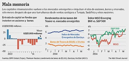 El ingreso de fondos a las monedas, las acciones y los bonos de los mercados emergentes marca un cambio de tendencia frente a la salida de casi US$60.000 millones en capitales a comienzos de 2014, resultado de las tensiones políticas en Turquía y las preocupaciones de que algunos países habían pasado a depender demasiado de la liquidez proveniente del estí-mulo de los bancos centrales.