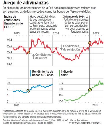 El dilema del dólar apunta a un desafío más amplio que afronta la Fed: la forma en que comunica su visión sobre las tasas de interés podría dificultar el logro de sus objetivos. Los funcionarios del banco central han estado señalando desde fines del año pasado que prevén subir las tasas de interés en 2015 puesto que proyectan un fortalecimiento paulatino de la economía. El mercado ha anticipado la medida y ha invertido en activos en dólares en busca de una mayor rentabilidad. Eso ha disparado el valor de la divisa y contribuido al enfriamiento económico actual.