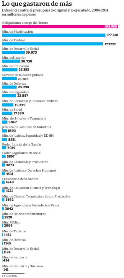 Junto con la ampliación del gasto, el jefe de Gabinete tuvo la posibilidad de reasignar partidas. La suma de ambas facultades arroja datos interesantes si se miran los últimos 10 años. La partida más beneficiada fue Obligaciones a cargo del Tesoro, con un exceso respecto de lo presupuestado en 10 años de $ 198.956 millones; en segundo lugar, el Ministerio de Planificación sumó $ 177.610 millones. Esa cartera fue la gran catalizadora de los subsidios a la energía, y mostró un uso voraz de sus recursos para pagar, entre otras cosas, las importaciones de gas y combustibles líquidos. Por su parte, el Ministerio de Trabajo, de donde salen los fondos para pagar una parte suculenta de las remuneraciones a empleados públicos y jubilaciones, sumó $ 173.222 millones y quedó en el tercer puesto en la lista de las áreas más favorecidas.