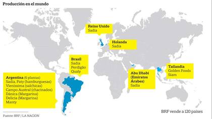 BRF, con unos 96.000 empleados y exportaciones a 120 países, tiene 35 unidades industriales en Brasil, seis en la Argentina -Llavallol y Baradero (Buenos Aires), San Jorge y Arroyo Seco (Santa Fe), Río Cuarto (Córdoba) y Villa Allende (San Luis)-, una en Reino Unido, una en Holanda y una en Emiratos Árabes, así como 35 centros de distribución en diferentes continentes. La empresa nació en 2009 mediante la fusión de Sadia y Perdigao, dos de las entonces mayores productoras de carne de pollo y de cerdo del principal socio del Mercosur.
