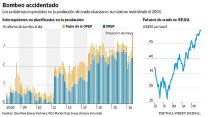 Cerca de 3,5 millones de barriles al día no han podido llegar al mercado debido a interrupciones como los ataques de milicias en Nigeria, los incendios forestales en Canadá y la agitación política en Libia. Se trata de más de 3% del total global, según ClearView Energy Partners LLC. Jacques Rousseau, director ejecutivo de hidrocarburos de la firma de investigación calcula que la cifra es, probablemente, la mayor desde que la guerra de Irak en 2003 afectó la producción.
