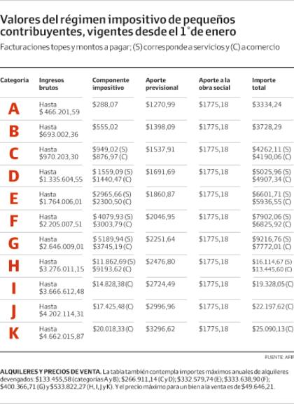 La actualización alcanza a los importes a pagar cada mes, en concepto tanto del componente impositivo como de los aportes a la obra social y al sistema previsional. Así, por ejemplo, en la categoría A el importe total pasa de $2646,22 a $3334,24. En la B, el monto pasa de $2958,95 a $3728,29 y en la C sube de $3382,62 a $4262,11 (servicios) y de $3325,44 a $4190,06 (venta de cosas muebles).