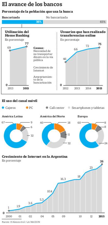 Un estudio especial para LA NACION de la consultora D'Alessio Irol destaca que el nivel actual de bancarización de los ciudadanos argentinos se encuentra en un 35% del segmento mayor de 18 años. Y de ellos, un 77% ya utiliza alguno de los servicios que su banco le ofrece en forma online. Esa cifra en 2013 era de 69%.