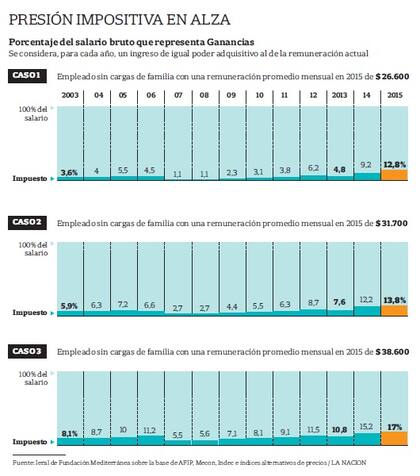 El estudio determina con qué porcentaje del ingreso se quedó el fisco en el período que va de 1998 a la actualidad, considerando para cada año salarios de igual poder adquisitivo (ver datos de 2003 a 2015 en el gráfico). Para quien hoy, por caso, tiene una remuneración de $ 38.600, el tributo equivale al 17% del ingreso, en tanto que con un sueldo equivalente se pagaba 8,1% en 2003; 5,5% en 2007 (cuando algunas modificaciones produjeron un alivio), y 9,1% en 2011.