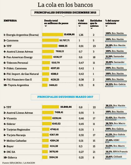 Los números que publica el Banco Central (BCRA) son elocuentes. En diciembre de 2015 (último año de la administración Kirchner), siete de los diez principales deudores del sistema financiero eran empresas del Estado: la energética Enarsa, Cammesa (administradora del sistema eléctrico), YPF, Austral Líneas Aéreas, Fideicomiso Financiero de Financiamiento Cammesa, Fideicomiso de Administración de Importación de Gas Natural y el Fideicomiso Financiero Gas II. Estas siete empresas concentraban créditos por $ 55.244 millones, el equivalente al 4% del total de préstamos de todo el sistema, o también el 1% del producto bruto interno (PBI) de entonces. Además, el 86% de la deuda estaba en cabeza del Banco Nación (BNA).