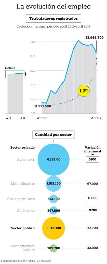 Esa situación no es para festejar. En el primer cuatrimestre del año, según datos oficiales en términos desestacionalizados, se sumaron 24.000 trabajadores privados registrados en un universo de casi 6,2 millones de empleados. Se trata de un exiguo crecimiento de 0,4%, al mismo ritmo de la economía.