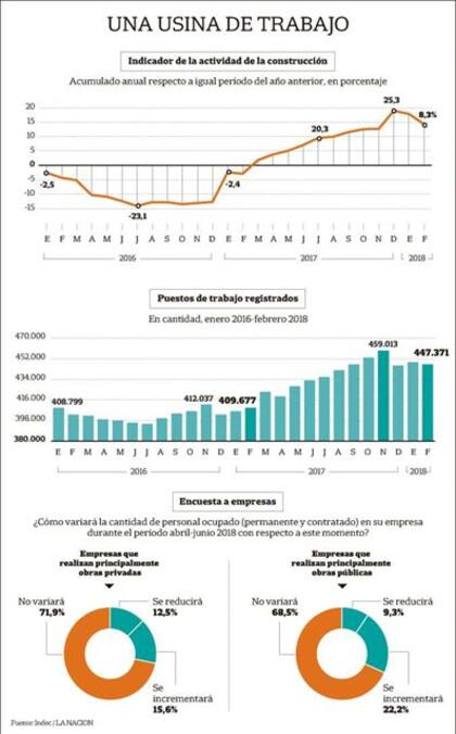 Uno de cada dos empleos asalariados privados registrados creados en 2017 fueron en el sector de la construcción. Según el Indec, en febrero de 2018 había 447.371 puestos de trabajo registrados en la actividad de la construcción, mientras que en febrero de 2017 había 409.677, es decir 37.694 empleos más en la comparación interanual. Según se consigna en el Reporte de Trabajo Registrado del Ministerio de Trabajo, en febrero de 2018 había un total de 78 mil asalariados registrados privados más que en febrero de 2017. "En la variación interanual se sigue constatando el peso de la Construcción, que dio cuenta del 55,5% de los nuevos puestos de trabajo creados en los últimos doce meses", explica el último informe del Instituto de Estadística y Registro de la Industria de la Construcción (Ieric).