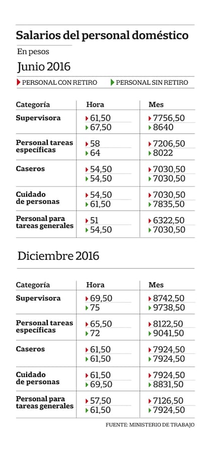 Para la categoría cinco, la más extendida porque engloba al trabajador con tareas de limpieza, lavado, planchado, mantenimiento, elaboración y cocción de comidas, y en general "toda la tareas domésticas típicas del hogar", el sueldo mínimo mensual para una persona con retiro pasará a $ 6322,50 mensual ($ 51 la hora) desde junio. En tanto, sin retiro, el salario del mes deberá estar por encima de los $ 7030,50 ($ 54,50 la hora). En diciembre, el personal con retiro deberá cobrar, por lo menos, $ 7126,50 ($ 57,50 la hora) y sin retiro, $ 7924,50 ($ 61,50 la hora).