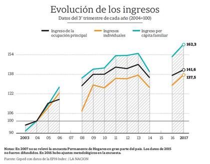 Descontada la inflación, y considerando como índice 100 los valores del tercer trimestre de 2004, el ingreso de la ocupación principal llegó a 144, el individual a 135, y el per cápita familiar a 153cuando se preparaba la contundente reelección de Cristina Kirchner. Esa evolución habla de una importante mejora de la capacidad de compra de salarios e ingresos no laborales individuales, y, más aún, de los mecanismos redistributivos recibidos por las familias. En 2017, esos valores se ubicaron en 142, 137 y 162. Aun con el sacudón de 2014 y la caída del PBI y los ingresos en 2016, en 2017 habríamos recobrado los valores de las vísperas del tercer mandato kirchnerista. En los ingresos familiares, con una mejora más que notable