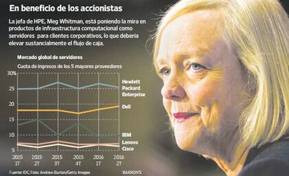Whitman pretende que HPE trabaje con las empresas para actualizar su infraestructura informática, incluyendo hardware, software, recursos de redes y servicios, para que funcione adecuadamente en un entorno dominado por la nube. En un correo electrónico enviado a Barron’s, indicó que “al lograr nuestra visión de ser el proveedor líder de TI híbrida, crearemos una compañía de crecimiento más veloz, márgenes más altos y un flujo de caja más robusto”. HPE tiene una posición particularmente sólida en la provisión de servidores y la infraestructura sigue siendo un segmento en expansión, aunque no en forma acelerada.