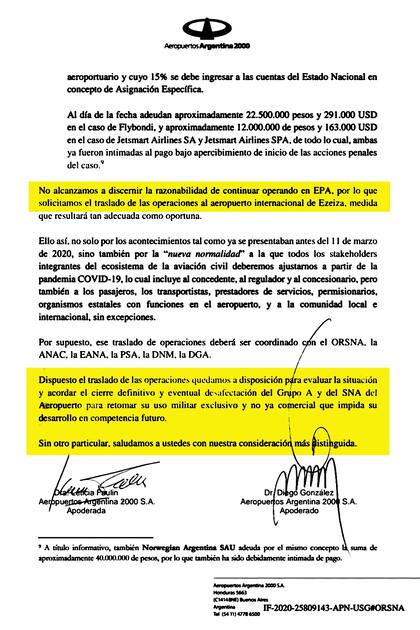 Los ejecutivos de Aeropuertos Argentina 2000, la concesionaria de la estación, no anduvieron con vueltas. "Tenemos el agrado de dirigirnos a ustedes a fin de solicitar al Orsna [Organismo Regulador del Sistema Nacional de Aeropuertos] el cierre del Aeropuerto de El Palomar y el traslado de las operaciones al Aeropuerto de Ezeiza", inicia la carta firmada por dos apoderados de la compañía y que está fechada el 14 de abril.