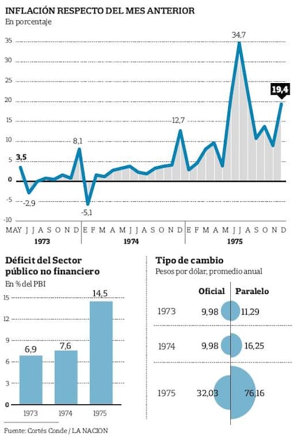 - En julio falleció Perón y lo sucedió su viuda, María Estela Martínez, quien en septiembre desplazó al ministro de Economía, José Ber Gelbard, y nombró a Alfredo Gómez Morales. "Tenía como antecedente un reconocido prestigio profesional y haber conducido la economía en los años duros de la recesión de 1951-1952. La administración no tuvo más remedio que flexibilizar los precios", dice Cortés Conde.