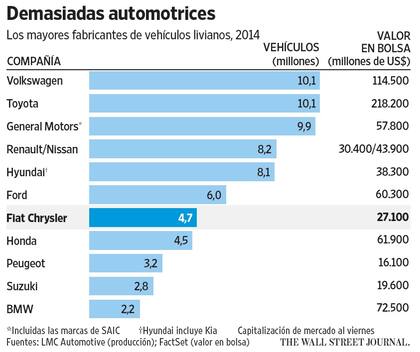 Marchionne sugirió el mes pasado que el bajo rendimiento sobre el capital debería ser solucionado con fusiones. Las grandes automotrices, sostuvo, reportaron en conjunto un retorno de 7,8% sobre el capital en 2014, comparado con 10% para el sector de petróleo y gas, 16% para el aeroespacial y de defensa y 19% para las industrias farmacéuticas.