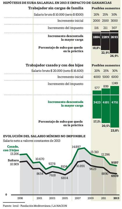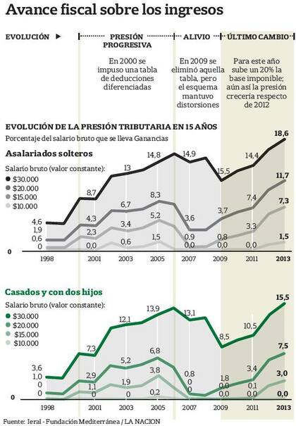 Un empleado soltero, con un ingreso de $ 12.450 neto de aportes a la seguridad social ($ 15.000 en bruto), tenía diez años atrás –con un salario de igual valor real– un descuento impositivo equivalente a 3,4% de su remuneración bruta, contra 6,3% en 2012 y 7,3% que sufriría este año. La estimación supone una inflación de 25% para 2013. Así, la presión se incrementa 114%, en tanto que se triplica y más desde 2009, cuando fue de 2 por ciento.