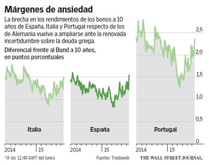 Las preocupaciones sobre un contagio de la crisis griega a otros países regresaron el lunes a los mercados. Los inversionistas están reduciendo sus posiciones en bonos de los países de la periferia de la zona euro y las deudas de España, Italia y Portugal se debilitaron drásticamente, extendiendo la caída de la semana pasada. Los rendimientos del bono soberano de España a 10 años subieron 0,13 punto porcentual para ubicarse en 2,37%, mientras que los bonos de los gobiernos de Ita-lia y Portugal treparon a 2,32% y 3,21%, respectivamente. La rentabilidad de la deuda aumenta cuando los precios caen.