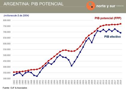 El PIB potencial también se estancó entre 1999 y 2003, pero después empezó a crecer dicho producto, por ejemplo, por los buenos precios de las commodities y por el aumento del mercado interno. Cuando la economía empezó a crecer, del 2003 hasta el 2008, lo hizo a un ritmo de 8,0 % anual o sea, se aprovechó bien la ventaja de la inversión efectuada previamente, en la convertibilidad. Este crecimiento fue con bajo gasto público y un fuerte superávit fiscal que, sumado al de las provincias, fue en algunos años del 6 % del PIB. Esto se cambió con Cristina Fernandez de Kirchner, que llegó a un fuerte déficit fiscal superior al 6 % del PIB y que complicó la evolución de la economía de allí para adelante. Con Macri no mejoró el gasto público, sino que aumentó y eso complicó más la evolución macroeconómica, atrasándose el tipo de cambio sobre lo que correspondería, es decir, con respecto al cálculo de la Paridad Teórica de Equilibrio (PTE).