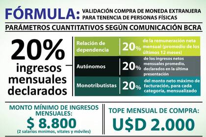 La suma se actualizó el lunes, a partir del aumento acordado del salario mínimo vital y móvil desde el 1 de septiembre a 4.400 pesos. La normativa contempla que un límite de 20% de los ingresos se pueden destinar a tenencia de moneda extranjera para empleados en relación de dependencia, autónomos y monotributistas.
