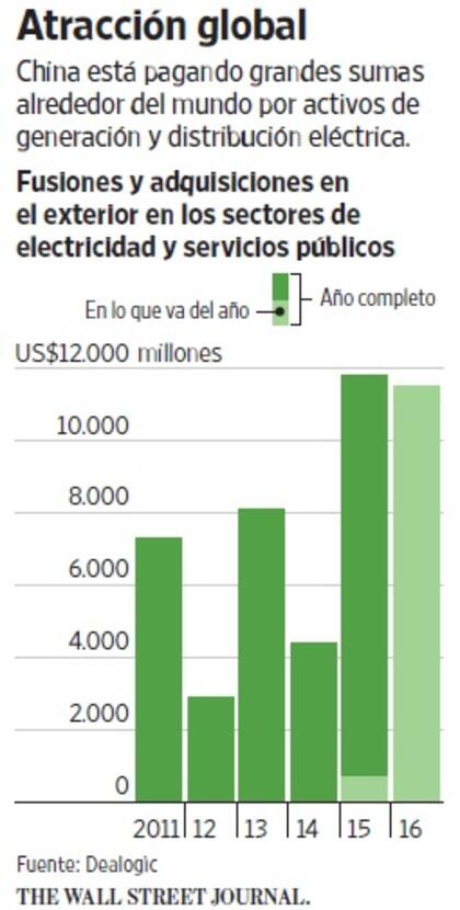 Este año, las empresas chinas han realizado una seguidilla de compras globales por una cifra récord de US$159.400 millones, incluyendo US$12.000 millones en acuerdos en el sector de electricidad y servicios públicos, según Dealogic.