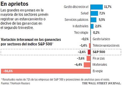 Hasta ahora, poco más de 70% de las empresas que conforman el índice S&P 500 han anunciado resultados. Se prevé que las ganancias ajustadas —que excluyen varias partidas consideradas extraordinarias— caigan por cuarto trimestre consecutivo, 2,6% frente al mismo período del año pasado, según Thomson Reuters. La firma proyecta que los ingresos desciendan 0,4% interanual, el sexto trimestre consecutivo a la baja.