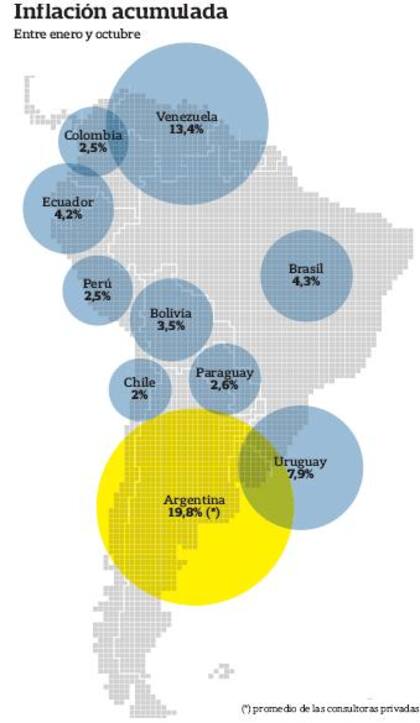Las diferencias son más marcadas cuando se analiza el comportamiento de los precios. La Argentina y Venezuela son los dos únicos países de la región que tienen una inflación de dos dígitos. Pero, en un año electoral, el gobierno de Hugo Chávez ha logrado desacelerar el ritmo de los aumentos y en los primeros diez meses de 2012 los precios minoristas acumulan una suba de 13,4%, contra el 20% de la Argentina.