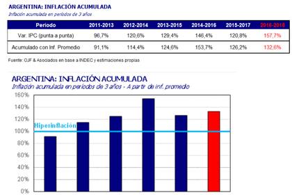 La Argentina tiene hiperinflación desde 2014, es decir, más de 100 % en el acumulado de tres años, tanto si se toman los precios minoristas desde enero a diciembre de cada año, como si se toma la inflación promedio anual de cada año, siempre en tres años.
