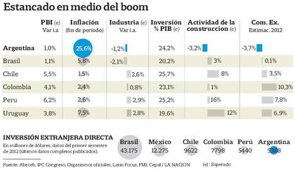 En inversión extranjera directa, en tanto, los 5388 millones de dólares que recibió el país hasta el primer semestre de 2012 (último dato publicado) sólo le alcanzan para ubicarse sexto en la región, detrás de Brasil (US$ 43.175 millones), México (US$ 12.275 millones), Chile (US$ 9622 millones), Colombia (US$ 7798 millones) y Perú (US$ 5440 millones). Álvarez destaca que este rubro ya venía mal en el país y estima que los datos definitivos de 2012 van a dar que fue el peor año en este aspecto.