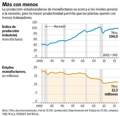 La producción de las fábricas no registró variaciones en noviembre, pero el empleo manufacturero cayó frente al mes anterior, según cifras de la Reserva Federal y el Departamento del Trabajo. La producción industrial ha vuelto a los niveles previos a la recesión, pero el empleo manufacturero no.