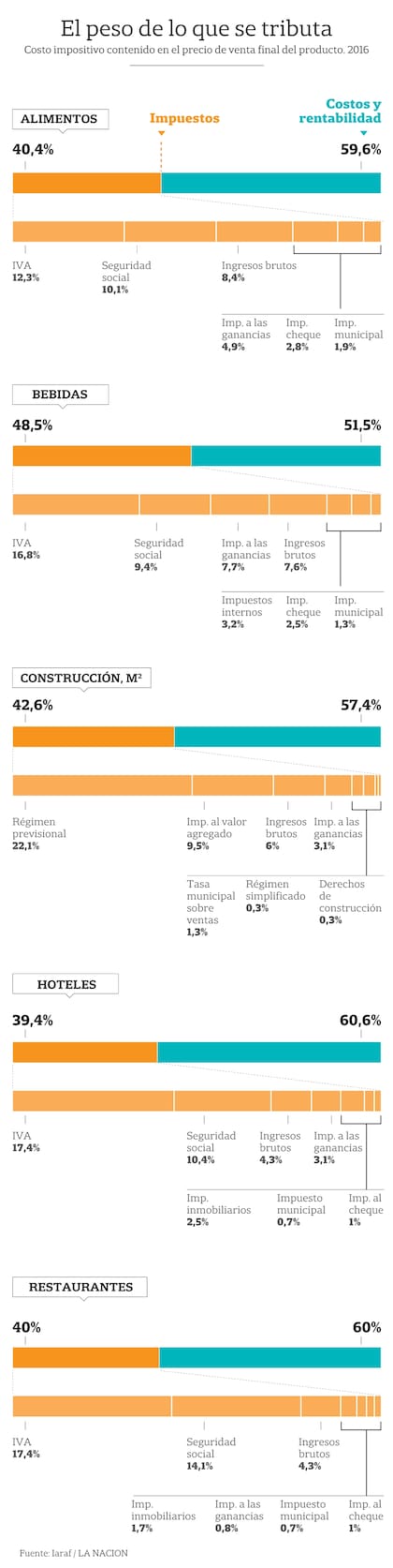 Por otra parte, cada vez que un consumidor paga su cuenta en un restaurante, 40% del costo se origina en impuestos nacionales, provinciales y municipales. En este caso, la distribución de esta carga sobre el precio final es la siguiente: IVA (17,4%), seguridad social (14,1%), Ingresos Brutos (4,3%), impuestos inmobiliarios (1,7%), impuesto al cheque (1%), impuesto a las ganancias (0,8%), tasas municipales (0,7%).