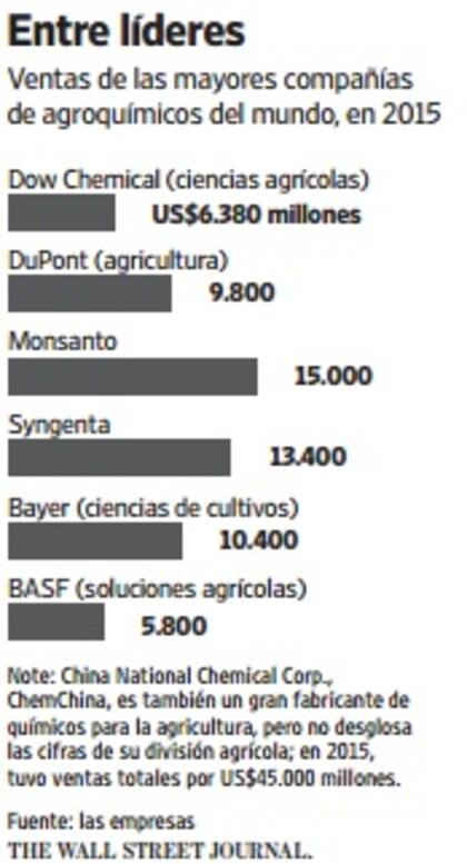 La planeada fusión de Bayer y Monsanto, valorada en US$66.000 millones incluyendo deuda, se produce en momentos en que Dow Chemical Co. y DuPont Co. también tratan de combinarse y después de que el grupo suizo de pesticidas y semillas Syngenta AG acordó hace unos meses ser adquirido por China National Chemical Corp.