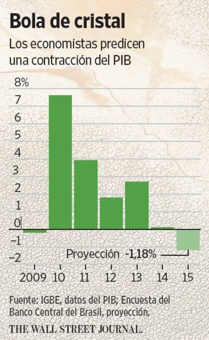 Economistas prevén que el Producto Interno Bruto de Brasil se contraiga 1,18% este año y crezca apenas 1% en 2016. Fiscales federales están en medio de una investigación que involucra cientos de millones de dólares supuestamente desfalcados al gigante de control estatal Petróleo Brasileiro SA, Petrobras, por destacadas empresas de construcción. Una sequía que lleva años amenaza la provisión de agua en el estado de São Paulo, que representa 40% de la producción industrial de Brasil.