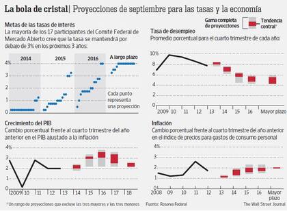 Las nuevas proyecciones sugieren que la mayoría de las autoridades del banco central esperan mantener las tasas de interés bajas por un período prolongado. Diez de 17 funcionarios esperan que la tasa de referencia del banco central continúe en 2% o menos para fines de 2016. Catorce de los 17 no prevén que la Fed comience a elevar la tasa de referencia hasta 2015 o después. Los pronósticos también dejan de manifiesto el complejo entorno económico que afronta Bernanke. El banco central redujo su proyección de expansión para este año y el próximo, previendo un avance de entre 2% y 2,3% en 2013 y de entre 2,9% y 3,1% en 2014. Sin embargo, su previsión del mercado laboral no ha variado mucho: prevén que la tasa de desempleo seguirá bajando a entre 7,1% y 7,3% para fines de 2014, casi lo mismo que pronosticaron en junio. Nueve de 10 funcionarios de la Fed estuvieron de acuerdo con la decisión sobre las compras de bonos.
