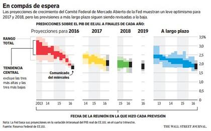 Las proyecciones publicadas por el banco central mostraron que 10 de 17 funcionarios del organismo anticipan un alza de un cuarto de punto de la tasa de fondos federales antes de diciembre. Eso ubicaría el tipo de referencia, que alude a préstamos interbancarios a un día, entre 0,5% y 0,75%. Tres funcionarios no contemplan movimiento alguno de aquí a fin de año. Cuatro, sin embargo, pretenden más de un aumento de las tasas, lo cual subraya las divisiones imperantes en el seno del banco central de EE.UU.