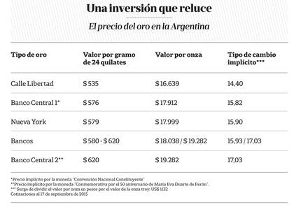 Con fecha del 17 de septiembre, el valor del gramo de oro en la calle Libertad cotizaba a $ 535, mientras que en los bancos ascendía a entre $ 581 y $ 620. Adquirir un gramo de oro considerando la Onza Troy en los Estados Unidos cuesta $ 579 (al tipo de cambio paralelo).