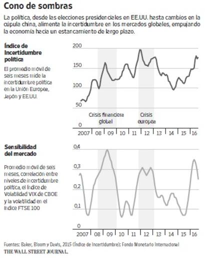 Desde las elecciones en Estados Unidos hasta la salida británica de la Unión Europea, un proceso conocido como brexit, pasando por la lentitud de las reformas en China, las autoridades económicas se han vuelto cada vez más ansiosas de que los acontecimientos políticos reduzcan el crecimiento global al desatar una reacción contra el libre comercio, reprimir la inversión y provocar la volatilidad de los mercados.