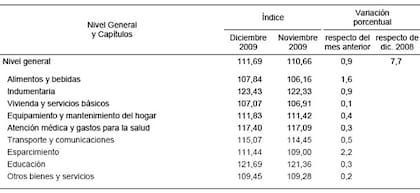 Los precios que mide el Instituto Nacional de Estadística y Censos (Indec) marcaron que durante 2009 la inflación se ubicó en 7,7%. El dato se cerró con la cifra de diciembre, mes en el que los precios minoristas crecieron 0,9%, el mayor avance del año.