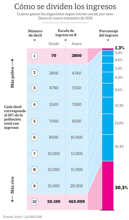 En el primer decil, aquellos que menos ingresos reciben, se llega a los $ 1475 (se quedan con 1,3% de la torta total), mientras que en la otra punta de la pirámide alcanza los $ 33.461 (el decil 10 se queda con el 30,3% del total de los ingresos).