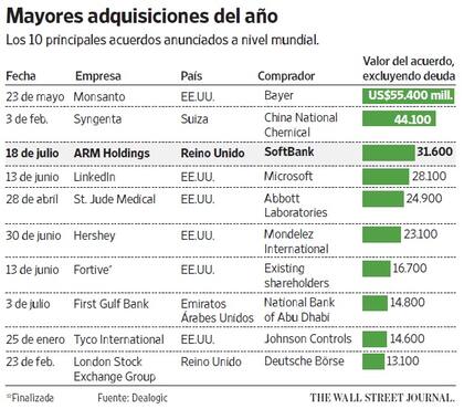 Ayer se anunció el más reciente. SoftBank Group Corp., conglomerado japonés de internet y telecomunicaciones, anunció la compra por US$32.000 millones de ARM Holdings PLC, firma británica que diseña los microprocesadores usados en más de 95% de los smartphones del mundo.