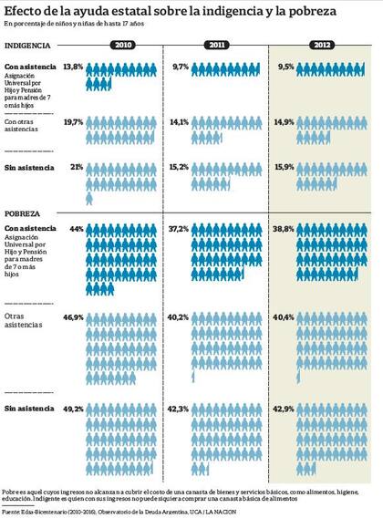 El informe señala que si el Estado no pagara la AUH ni la pensión prevista para madres de siete o más hijos, la pobreza y la indigencia entre los menores llegarían a 42,9 y a 15,9%, respectivamente. Y si no se hubiera creado la asignación por hijo, pero se hubieran mantenido otros programas previos, las tasas serían de 40,4 y de 14,9 por ciento.